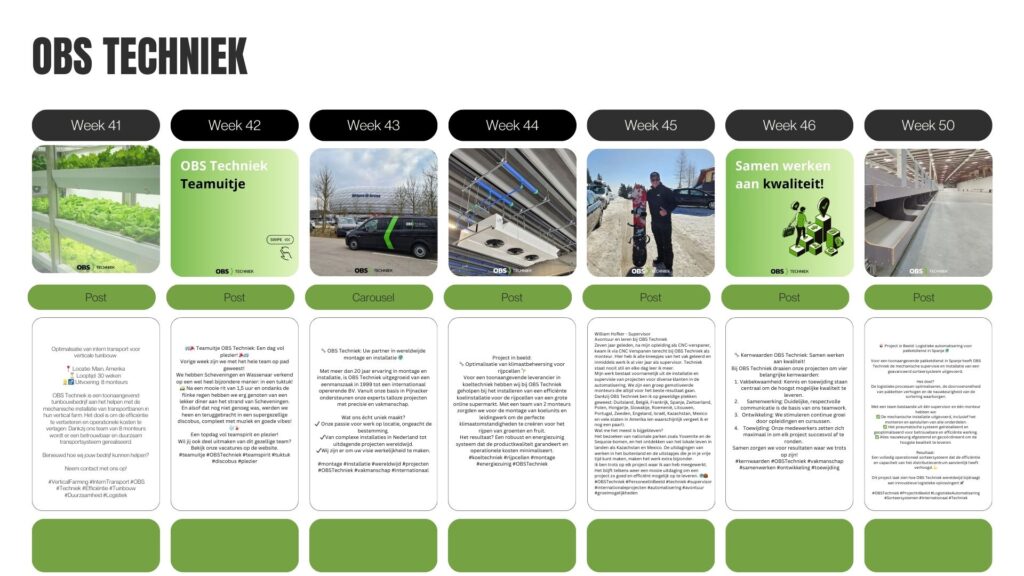 Wekelijks werkten we nauw samen met het interne marketingteam om de zichtbaarheid van OBS LinQ, OBS Techniek en andere onderdelen van de groep te vergroten. We verzorgden de wekelijkse content voor social media (waaronder LinkedIn), actualiseerden de websites, ontwikkelden gerichte LinkedIn-campagnes, hielden interviews, ontwierpen brochures en dachten strategisch mee over positionering en visie.